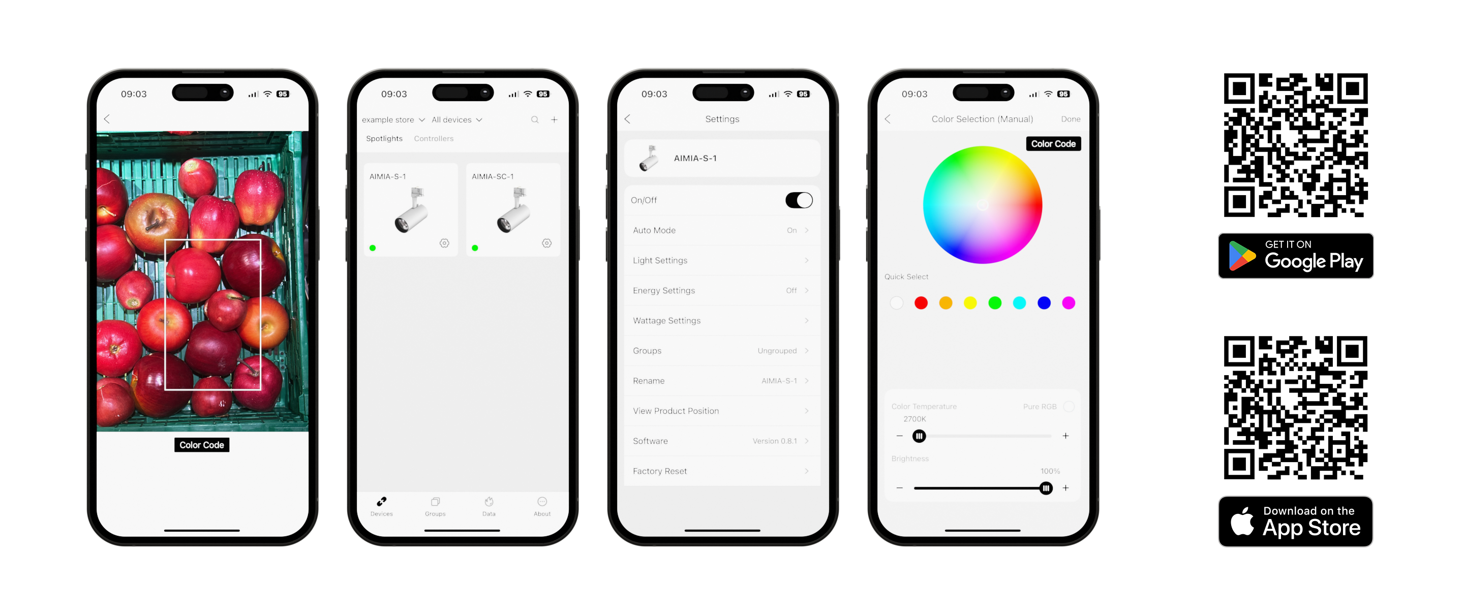 Al cuore della sua tecnologia si trova il sistema W+RGB COB LED, che consente di coprire un ampio spettro di temperatura colore, da 2.700 a 6.500 K. È possibile passare da toni caldi e accoglienti a luci fredde e nitide, in base alle esigenze dell’ambiente o dell’atmosfera desiderata. Con un indice di resa cromatica (CRI) pari o superiore a 95, AIMIA garantisce una riproduzione dei colori estremamente fedele e vivida, ideale per esporre prodotti, opere d’arte e materiali in modo realistico e accattivante.