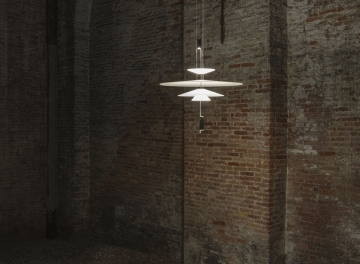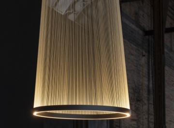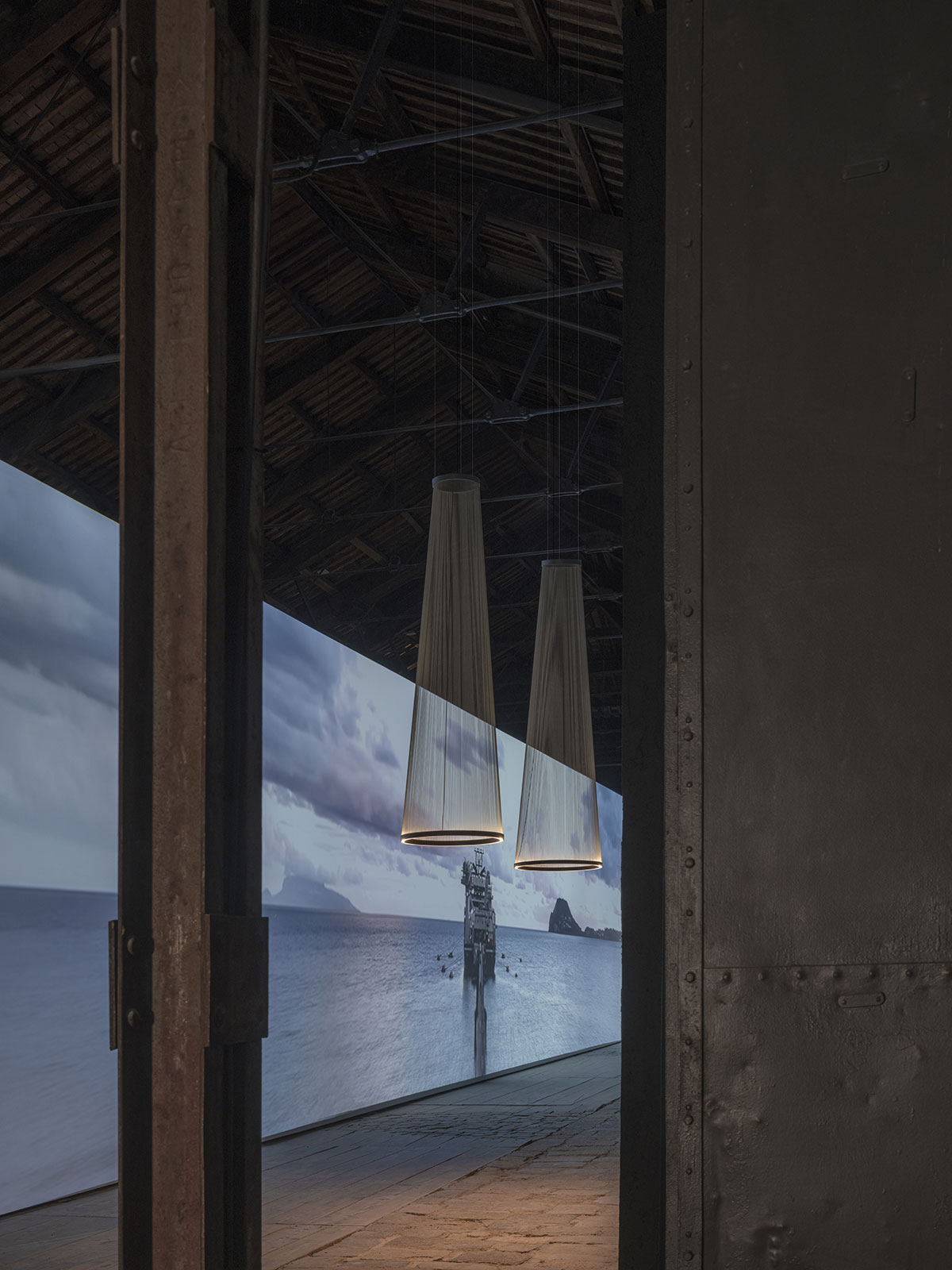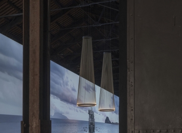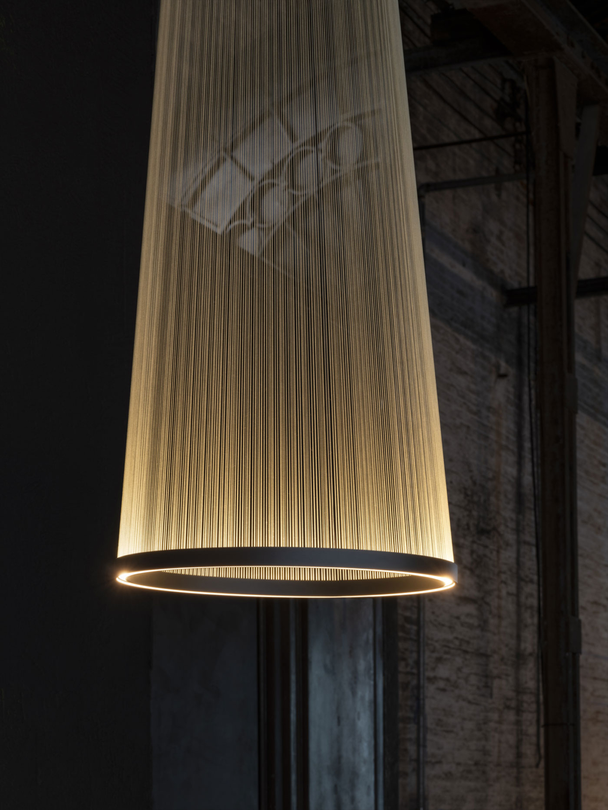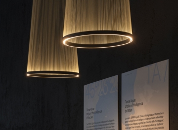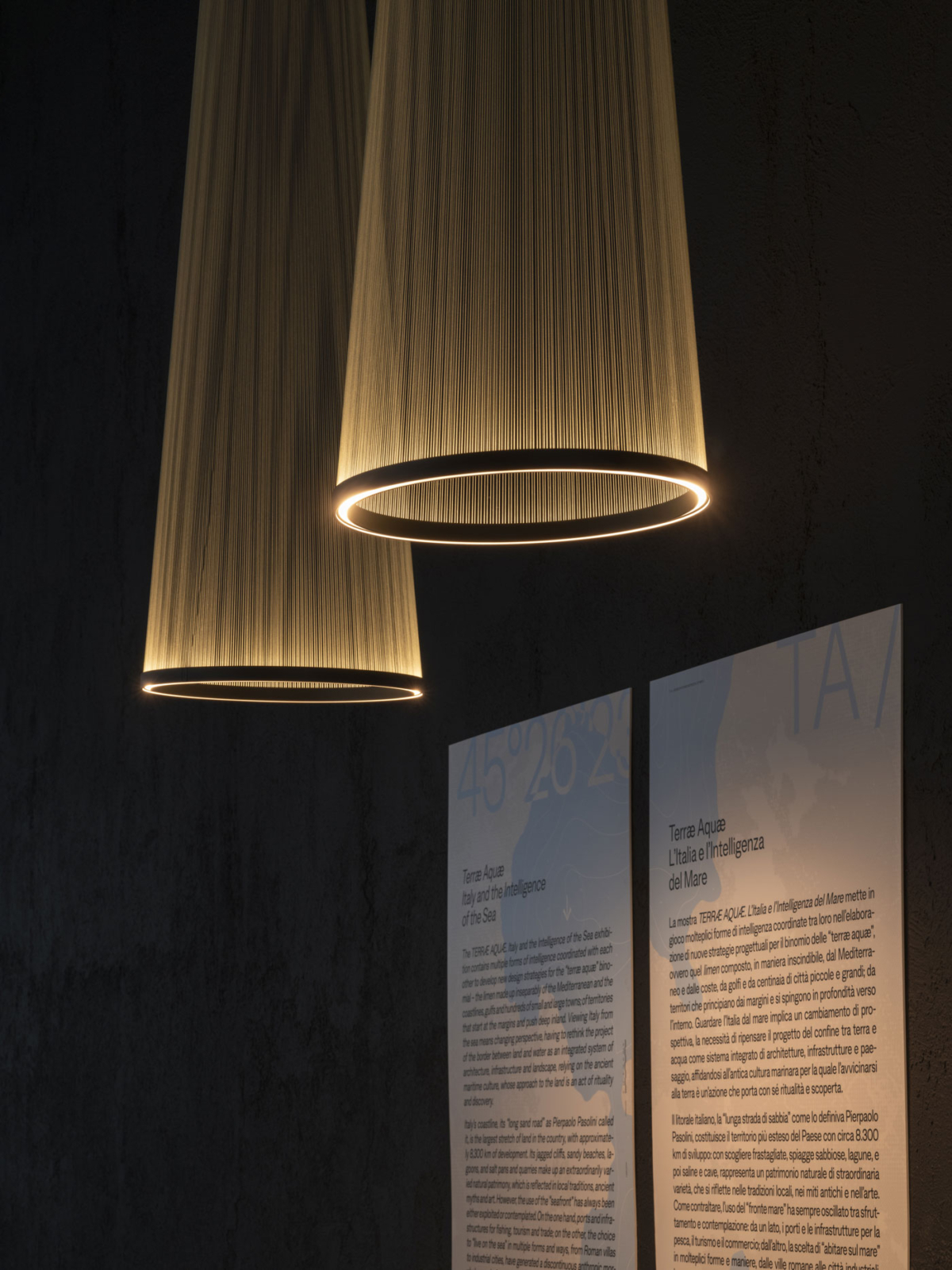 L’ampiezza del luogo conferisce ulteriore valore alla luce come elemento essenziale, in grado di creare tensione visiva e attrarre lo sguardo verso forme luminose cariche di malinconia. All’ingresso del padiglione, due sospensioni Array danno il benvenuto ai visitatori. Disegnate da Umut Yamac, offrono un impatto visivo immediato grazie a una luce discendente morbida, che sembra scaturire da sottili fili creando un’illusione ottica leggera e vibrante.