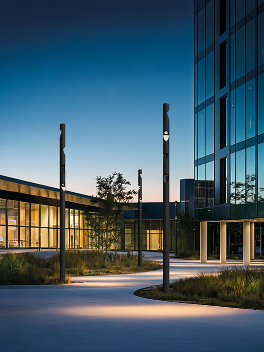 Dal punto di vista tecnico, SHIFT PRO è costruito con materiali di qualità elevata: alluminio estruso per il palo e la testa, pressofusione per il corpo lampada e vetro temprato extra-chiaro da 8 millimetri. L’intera struttura è progettata per resistere anche agli ambienti più esigenti grazie alla combinazione di protezione IP66 — che lo rende impermeabile e resistente alla polvere — e resistenza agli urti classificata IK10. La verniciatura è realizzata con un doppio trattamento anticorrosione per garantire lunga durata anche nelle installazioni outdoor più complesse.Sul fronte della luce, SHIFT PRO offre diverse temperature di colore tra cui 2700K, 3000K e 4000K, così da integrarsi perfettamente in qualunque contesto architettonico o paesaggistico. Le caratteristiche fotometriche, unite a un’efficiente gestione elettronica tramite protocolli DALI 2 o PUSH, permettono di ottenere un’illuminazione uniforme e controllabile con precisione. Anche le prestazioni sono elevate: uno dei modelli rappresentativi, il S.1480W, sviluppa oltre 2000 lumen reali con consumi ridotti, confermando la vocazione del sistema all’efficienza energetica.